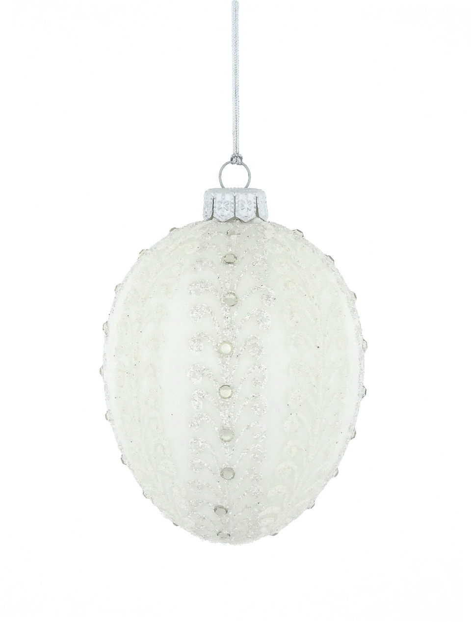 A glass Christmas tree bauble in the shape of a Faberge egg in white