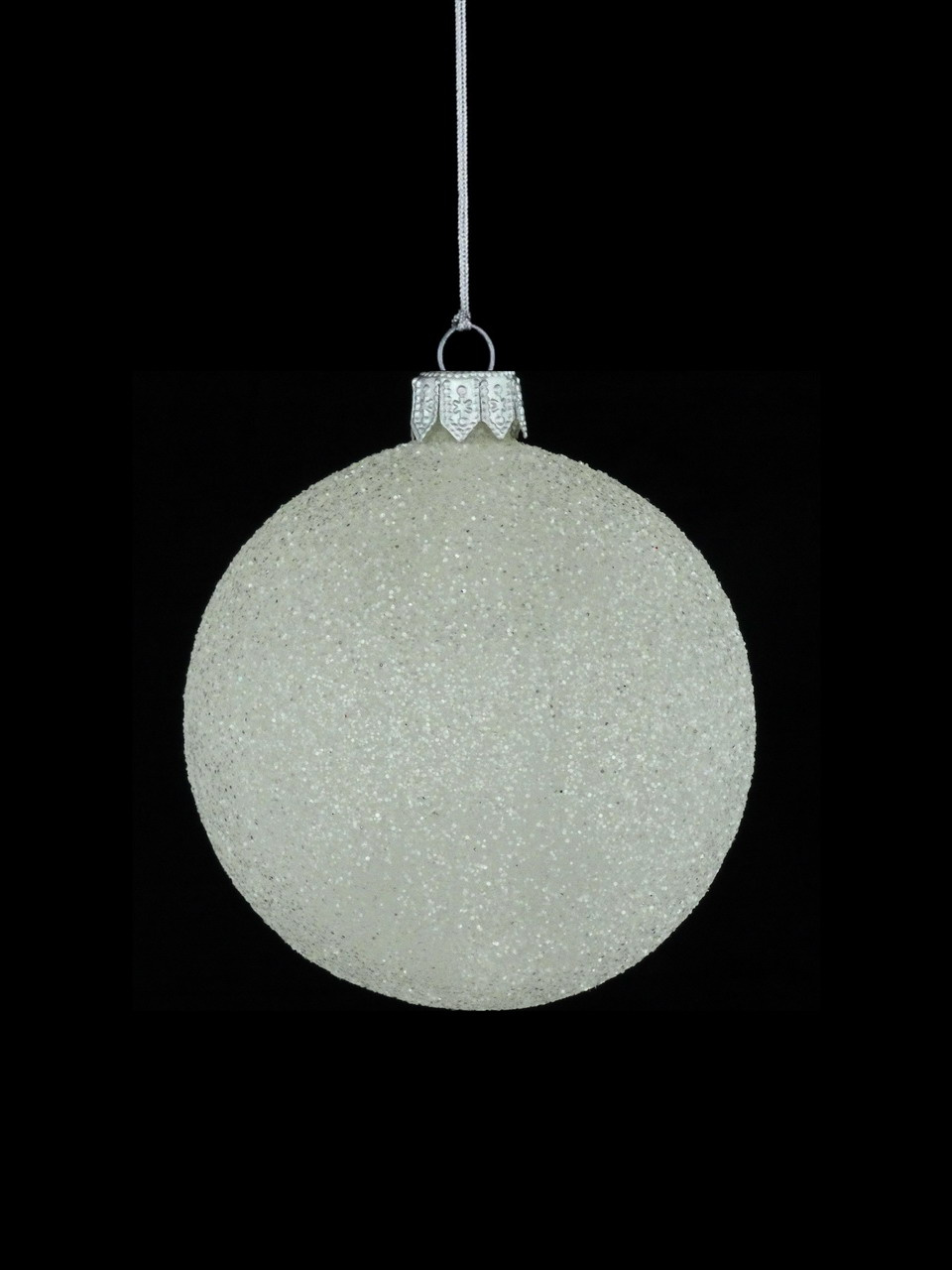 "A set of 6 glass Christmas baubles in white with glitter
