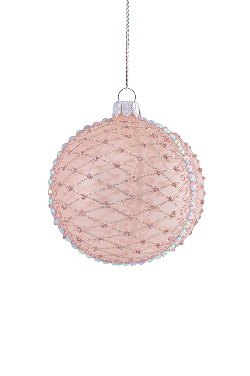 Set of 6 glass Christmas baubles with glitter decoration in pink color and pearls