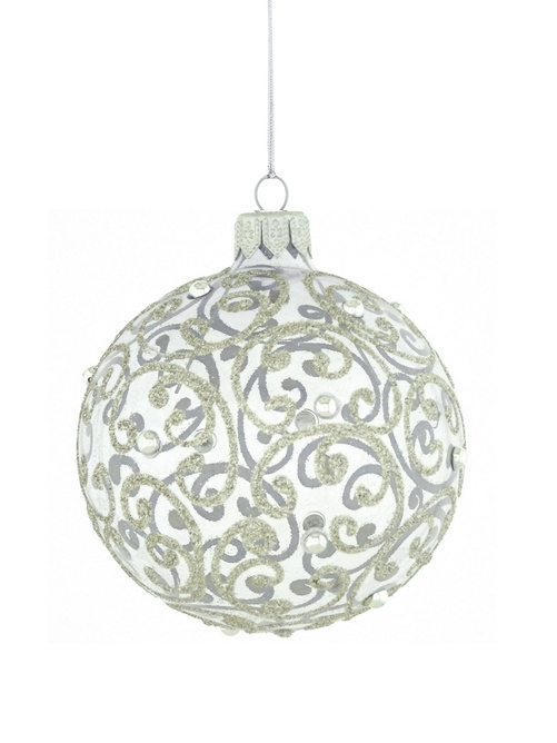 Set of 6 glass Christmas baubles with glitter decoration in silver color and silver stones