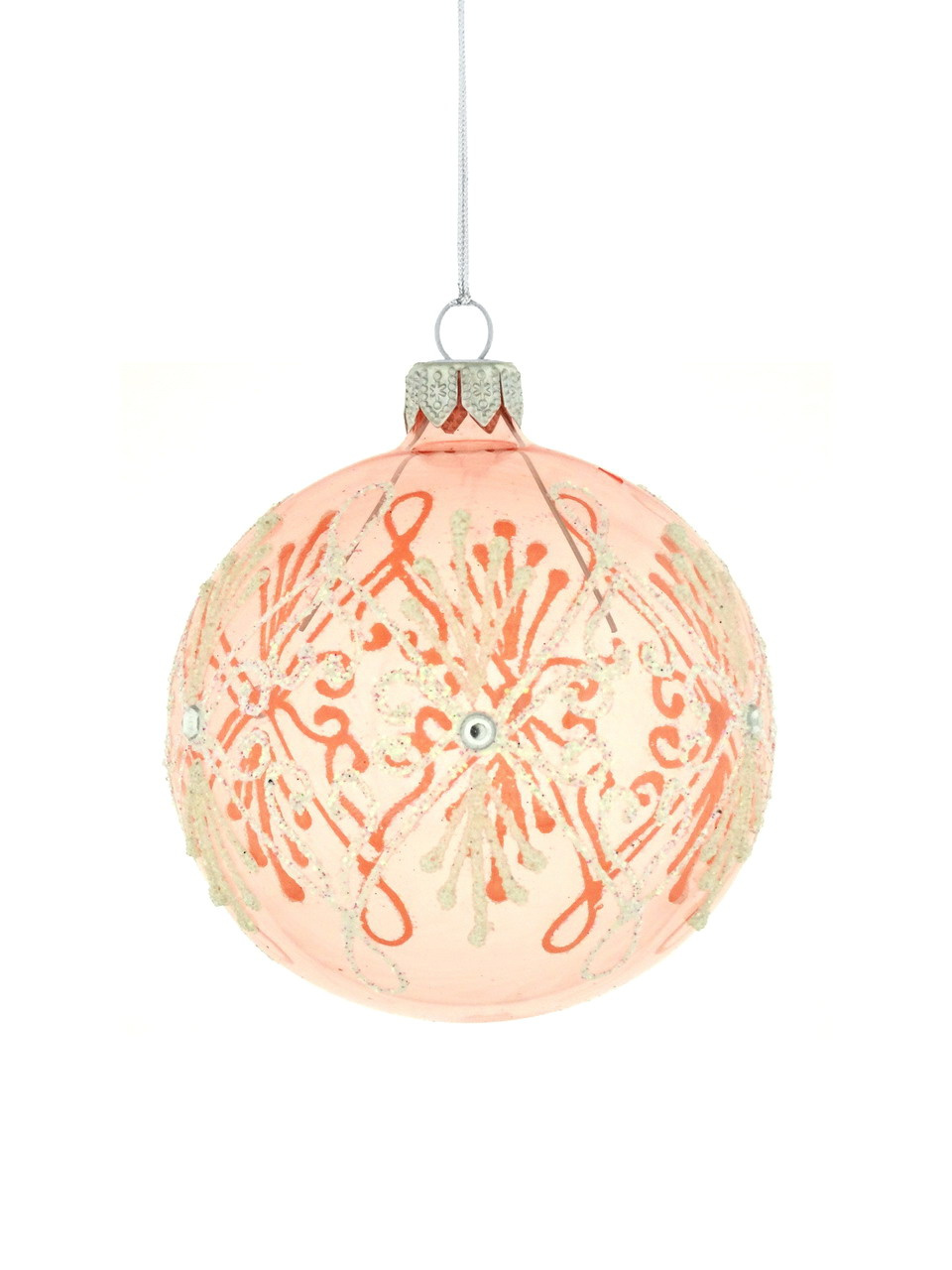 A set of 6 glass Christmas baubles with ornamental decoration.