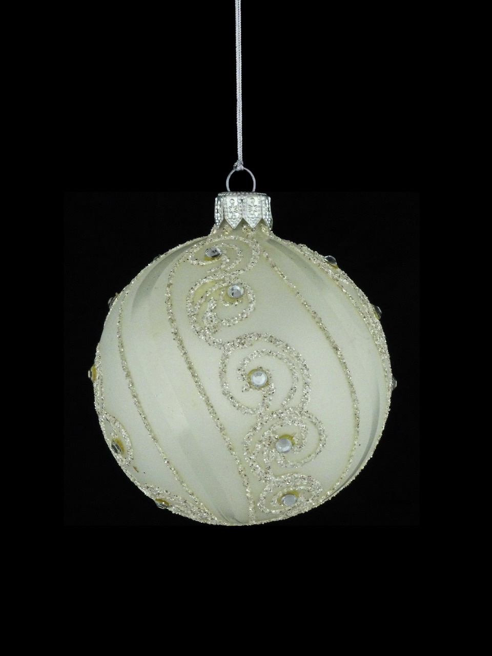 A set of 6 glass Christmas baubles with decorations made with glitter and stones.
