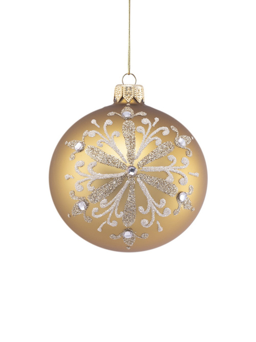 Set of 6 glass Christmas ornaments with glitter decoration in white and gold colors and stones
