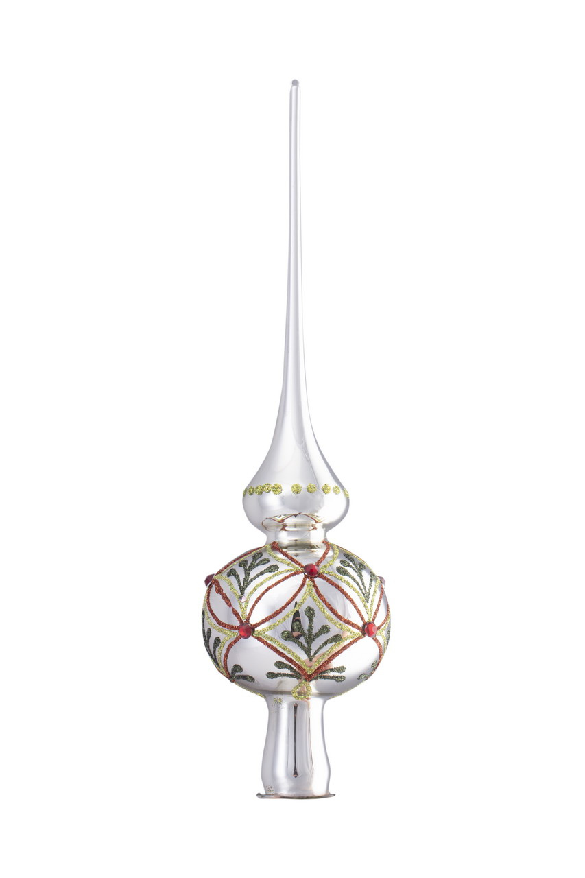 Długi, szklany szpic na choinkę ze srebrnym, błyszczącym tłem.