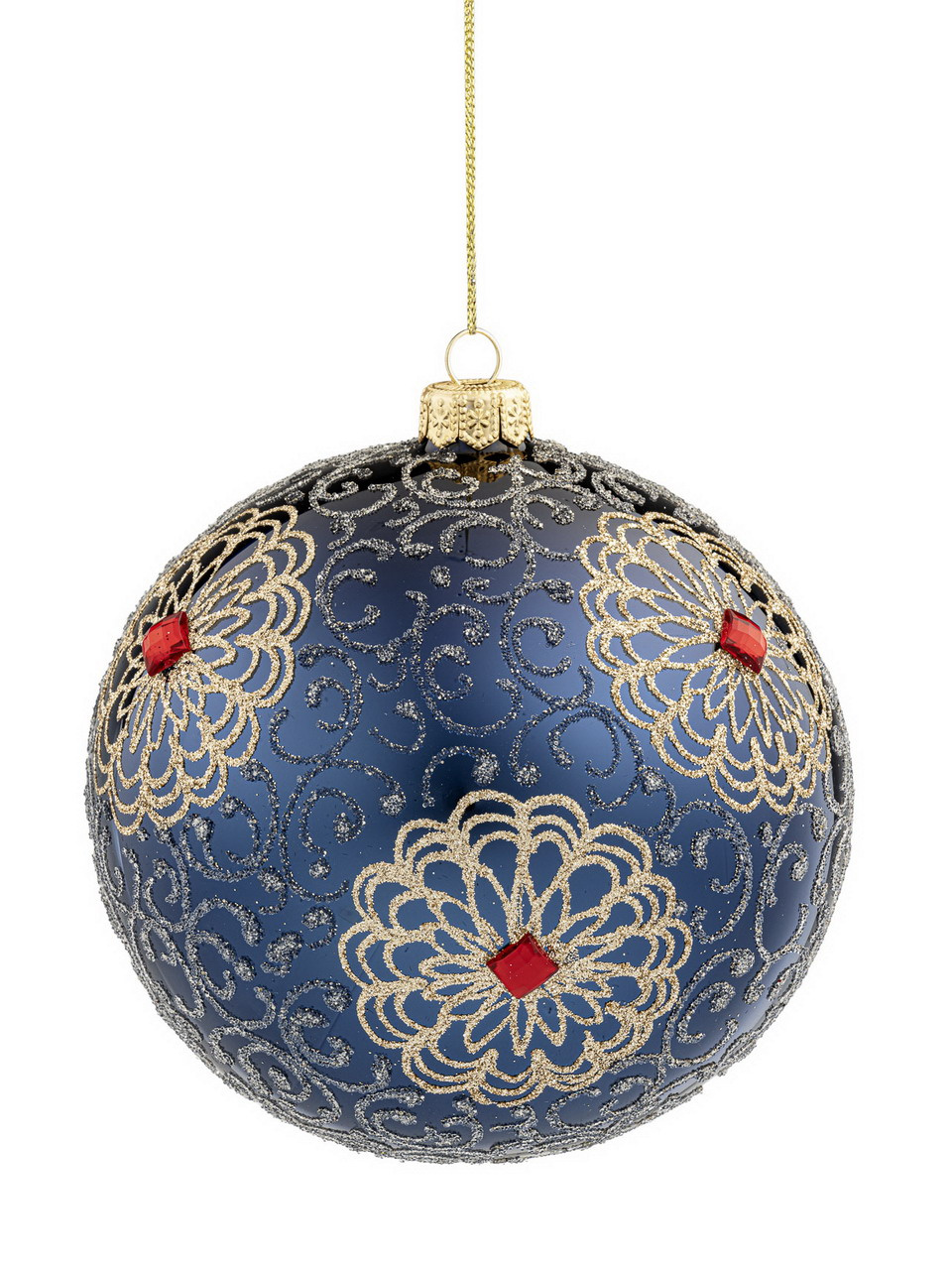 Duża, szklana bombka z błyszczącym, granatowym tłem.