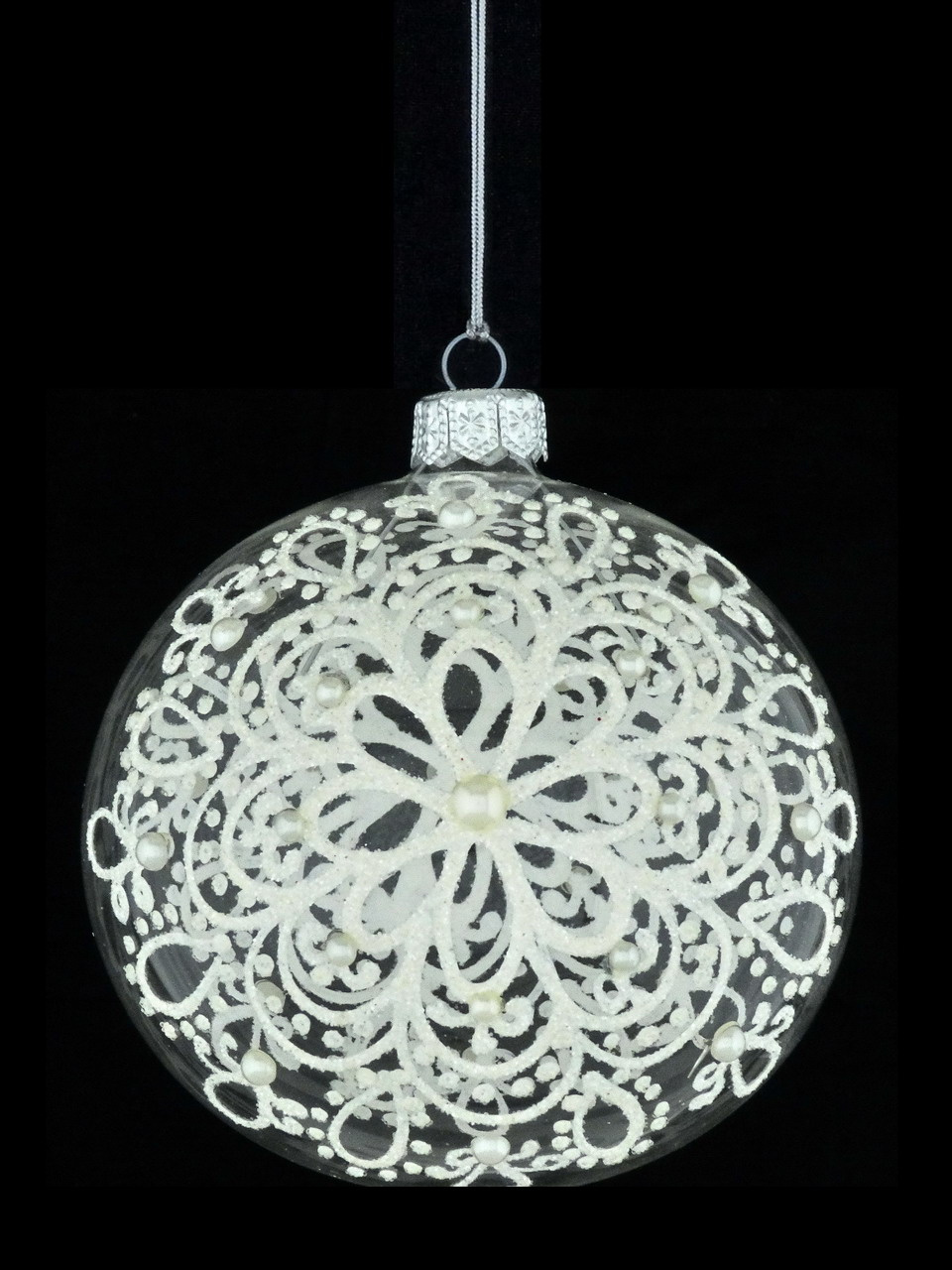 Zestaw 4 szklanych bombek choinkowych z brokatową dekoracją w białym kolorze oraz białymi perełkami