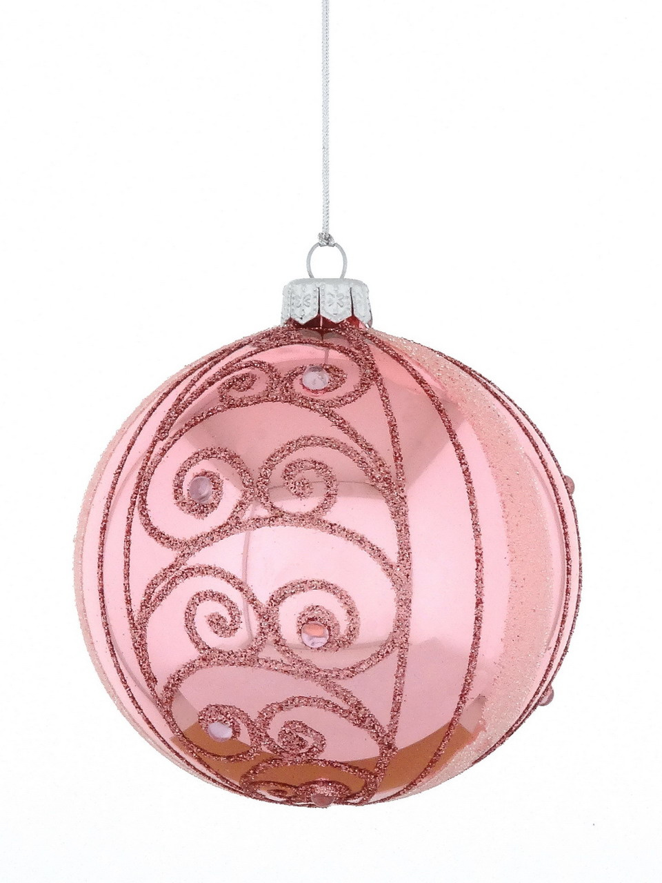 Zestaw 4 szklanych bombek choinkowych z dekoracją ornamentową na różowym tle