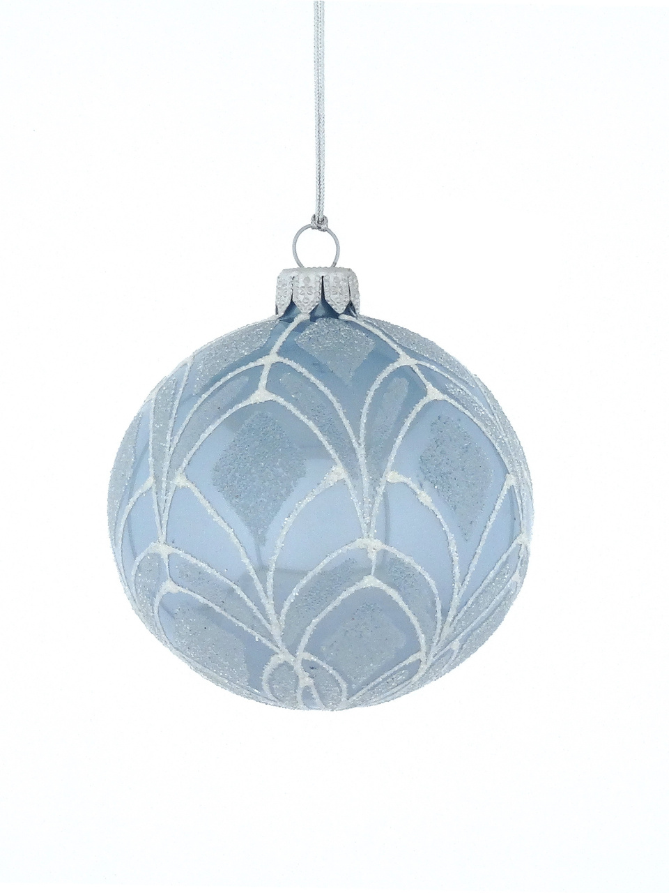 Zestaw 6 szklanych bombek choinkowych w niebieskim kolorze i białą dekoracją