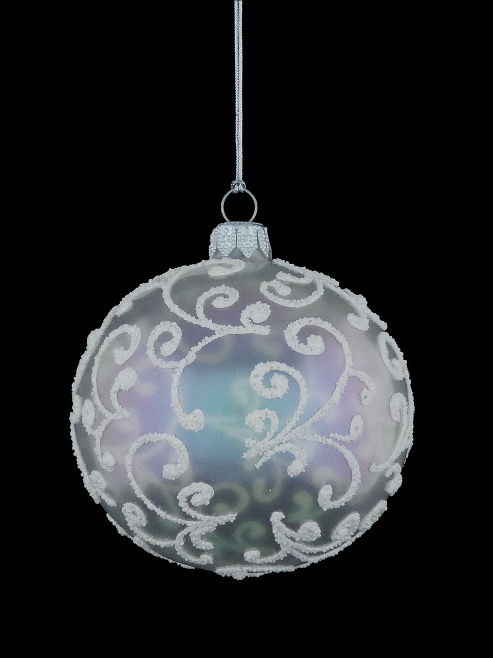 Zestaw sześciu szklanych bombek z delikatnym wzorem i efektem iryzowania.