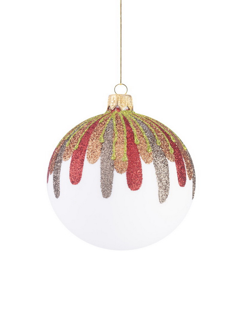 Zestaw czterech szklanych bombek z białym tłem i kolorową dekoracją.