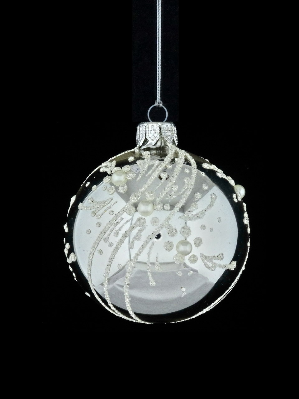 Zestaw 6 szklanych bombek choinkowych z brokatową dekoracją w bialo-srebrnym kolorze oraz bialymi kamieniami