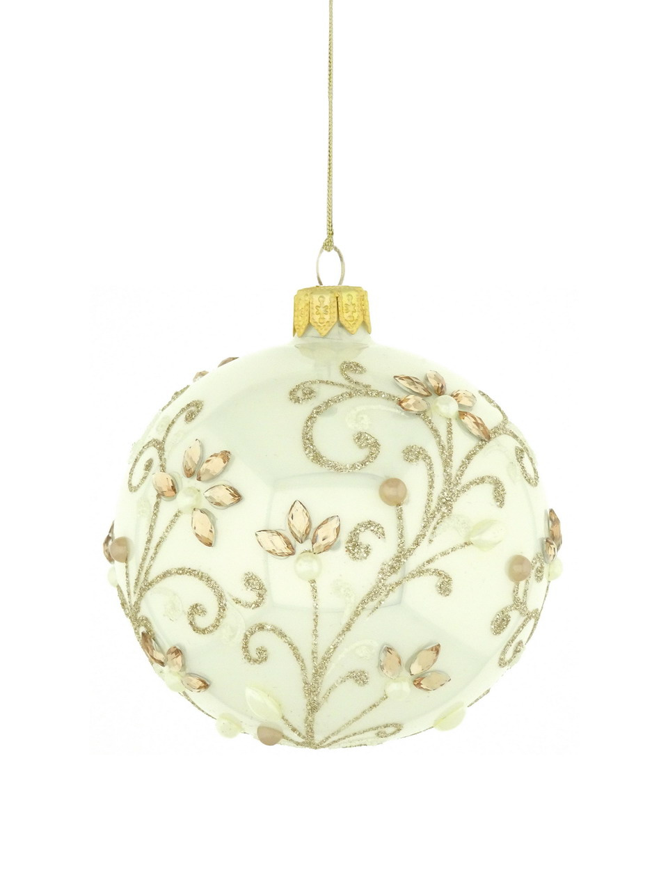 Zestaw 6 szklanych bombek choinkowych z brokatową dekoracją w złotym kolorze oraz beżowymi kamieniami
