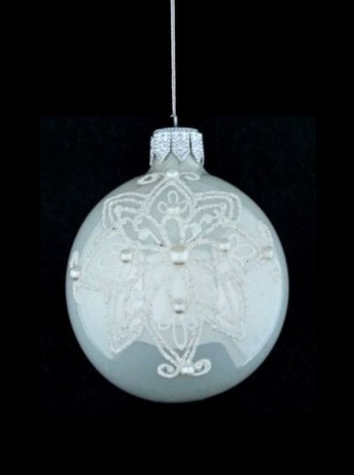 Zestaw 6 szklanych bombek choinkowych z brokatową dekoracją w bialo-srebrnym kolorze oraz bialymi perełkami