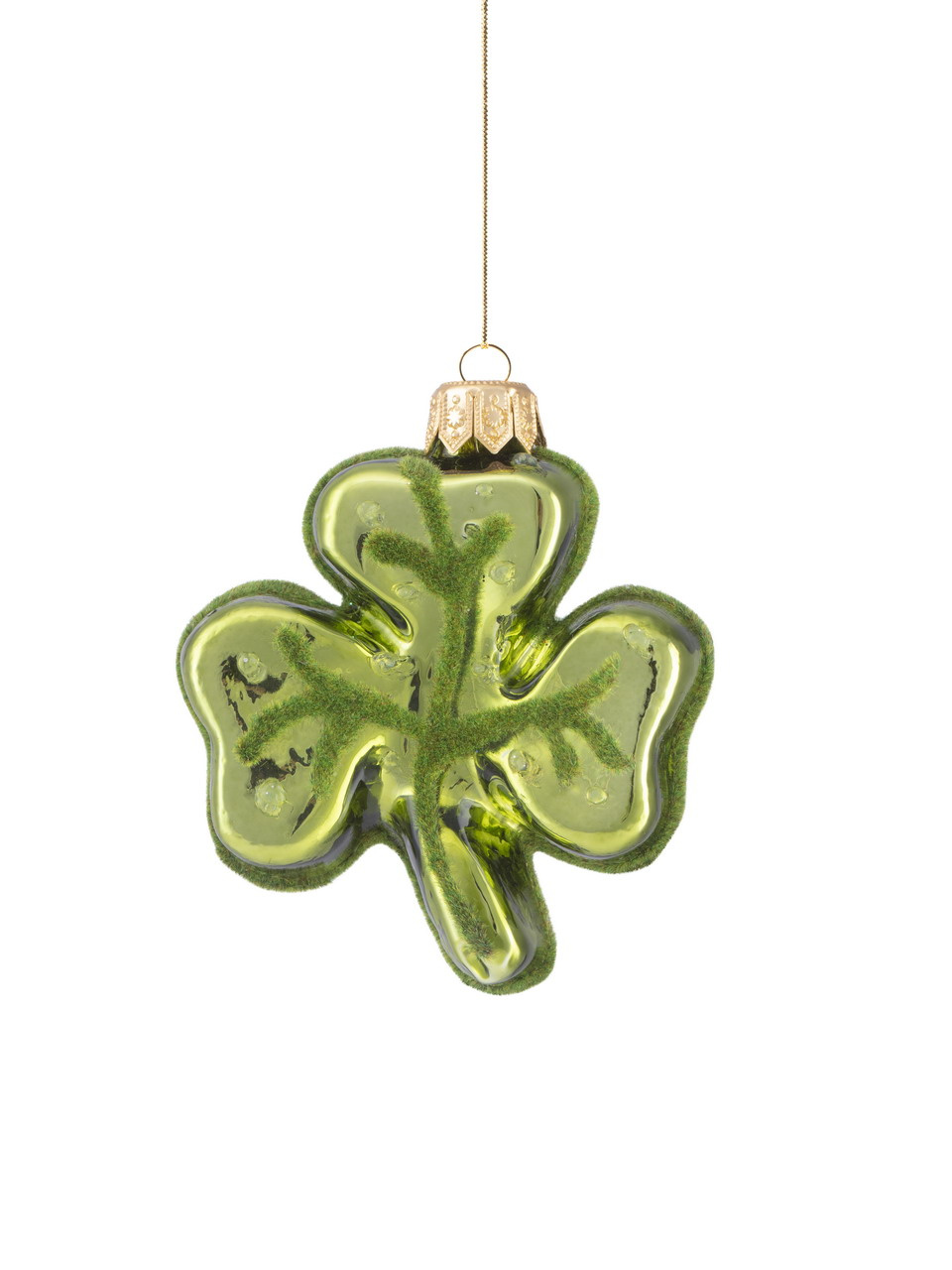 Zestaw sześciu małych, szklanych bombek w kształcie koniczyny.