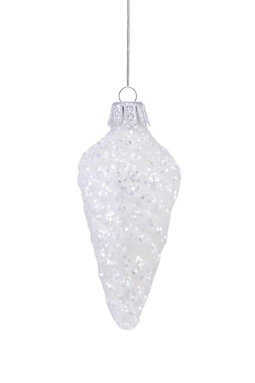 Zestaw sześciu małych, szklanych bombek w białym kolorze.